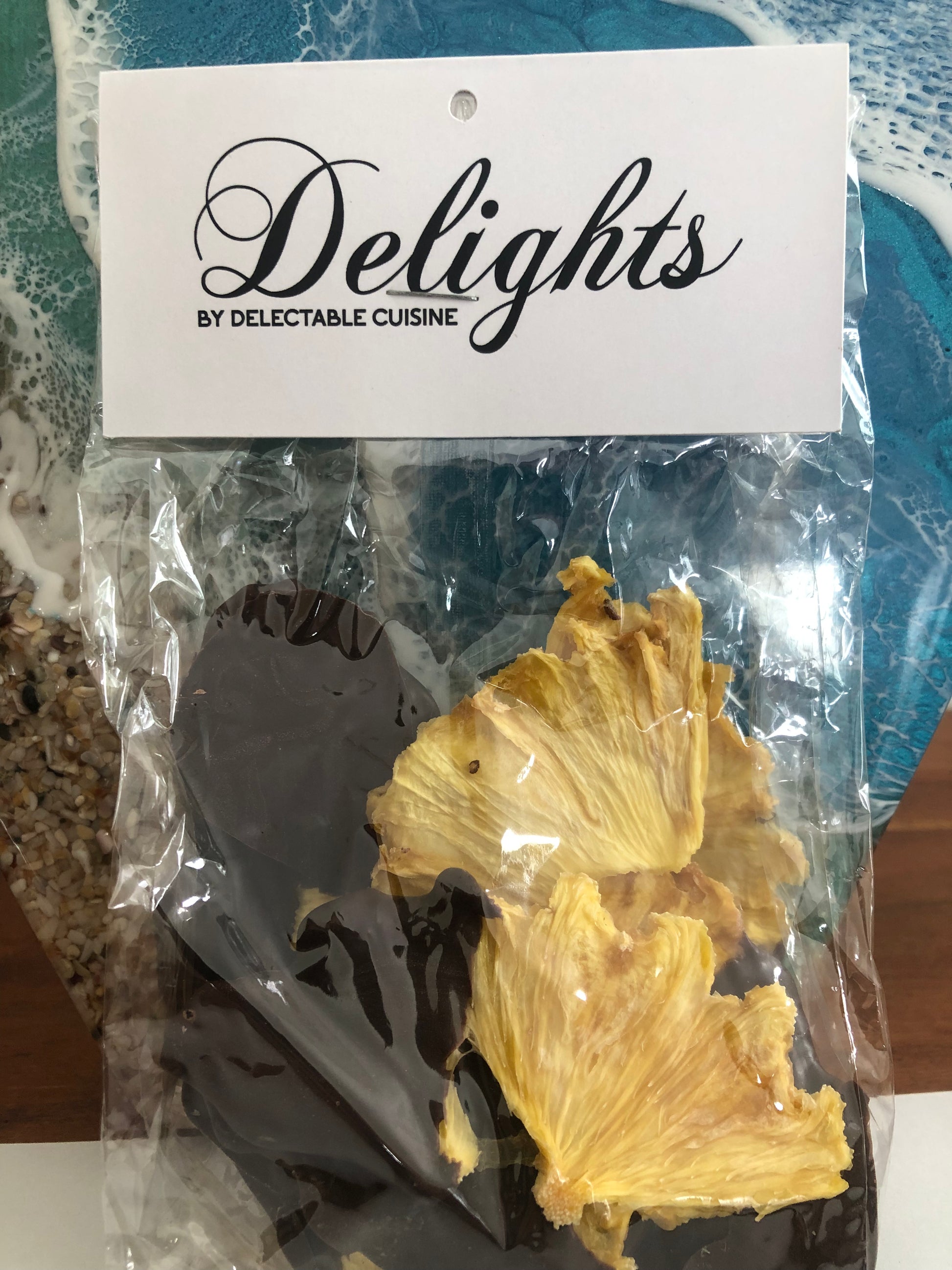 Made from Imported Fresh pineapples. Hand processed by our team they are peeled, sliced, dehydrated and finally hand dipped in 54% Belgium dark couverture.